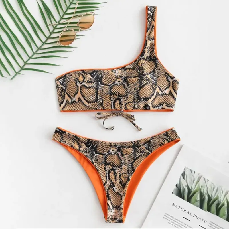 Special Price of Artificial Snake Skin Printed Women Tankini One Shoulder Lace-up Thick Bikini Swimwear Lady Padded